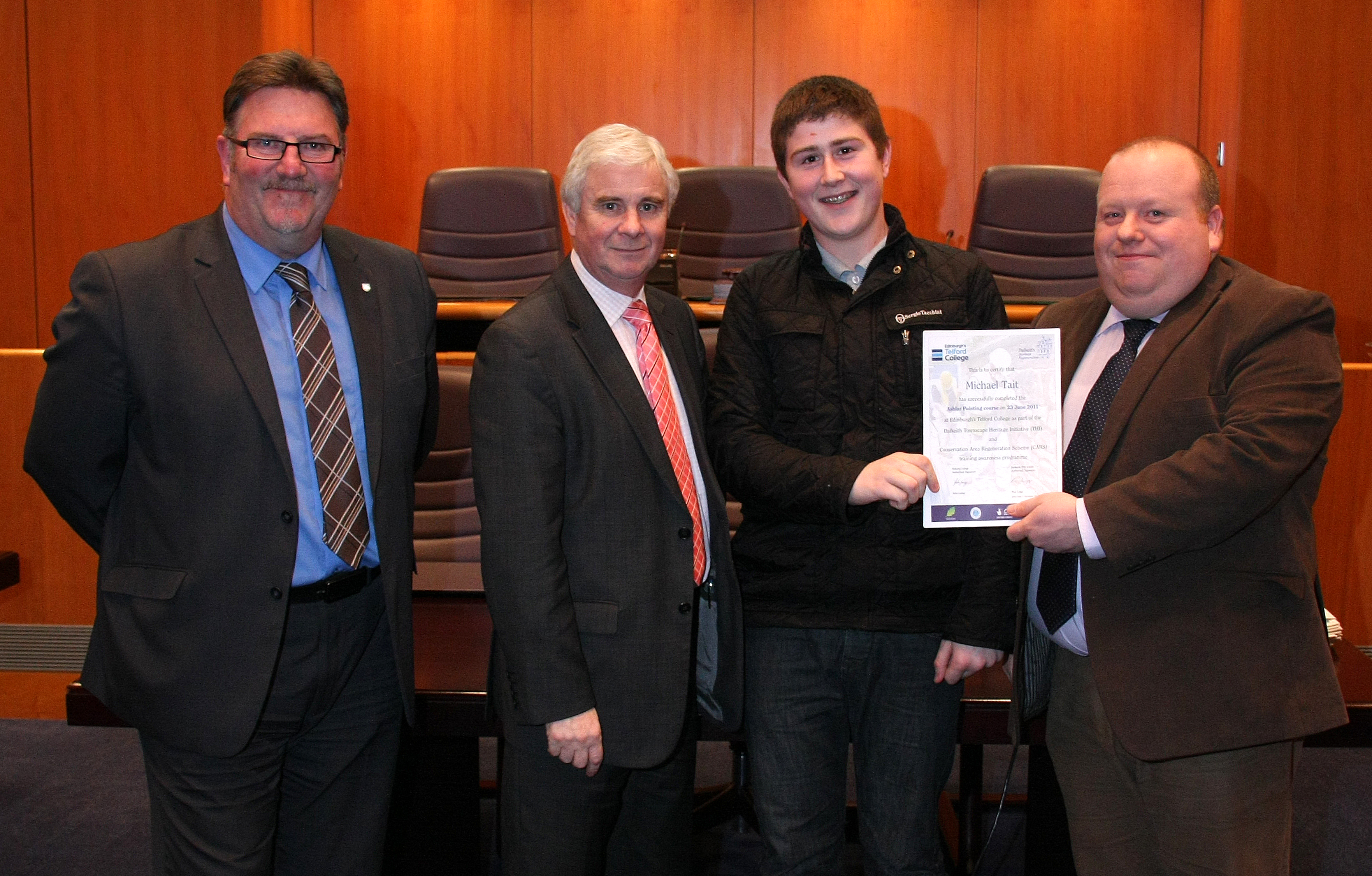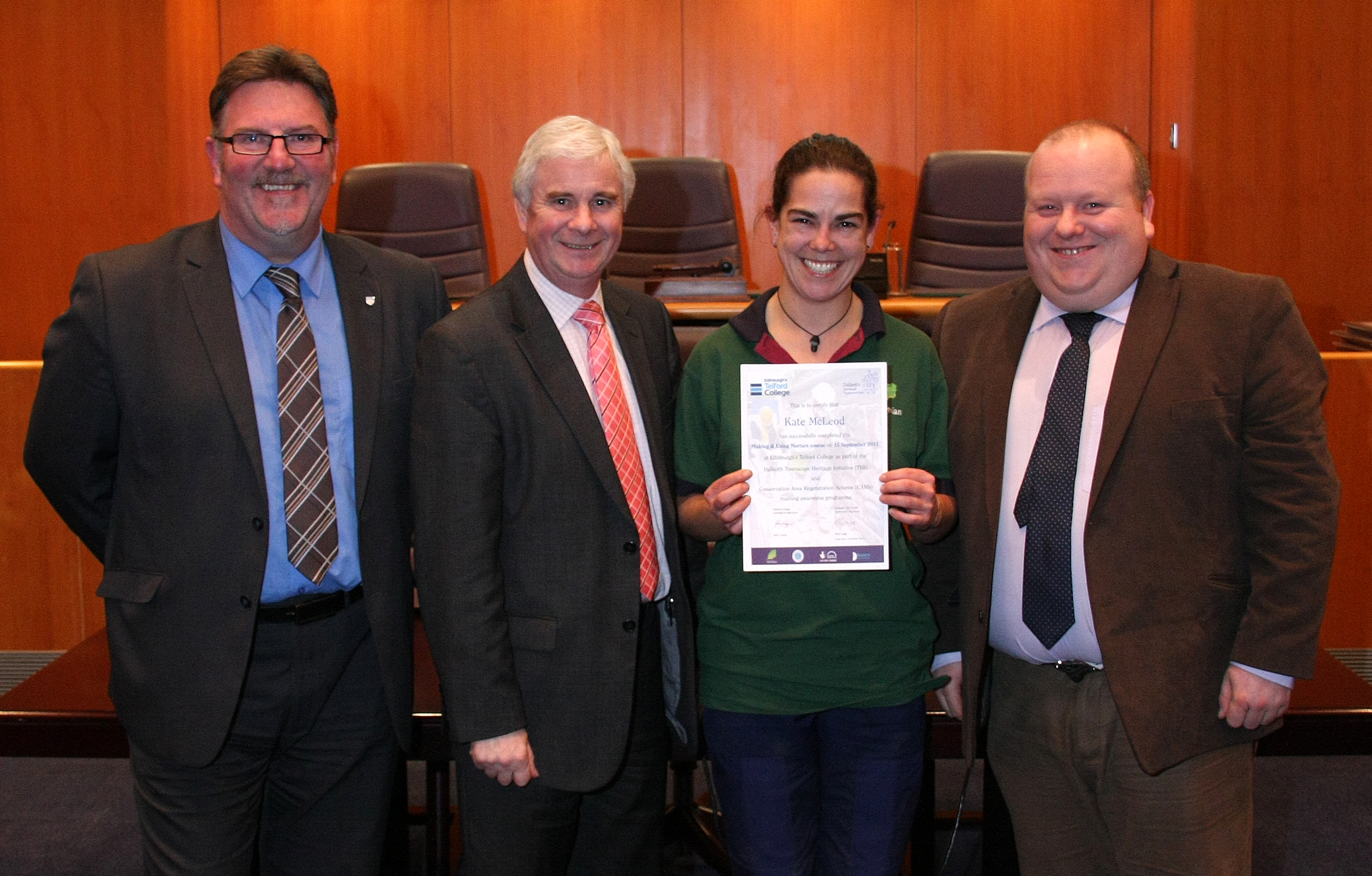A presentation ceremony was held in Midlothian Council Chamber on the 1st December where the trainees received their certificates from Colin Tennant, Head of Skills and Materials at Historic Scotland and John Laing, Head of Development (construction) at Telford College in Edinburgh. Councillor Russell Imrie, Council Member for Strategic Services at Midlothian Council officially presided over the event and was very pleased to see young people taking the opportunity to gain training in historic building repair and restoration techniques.