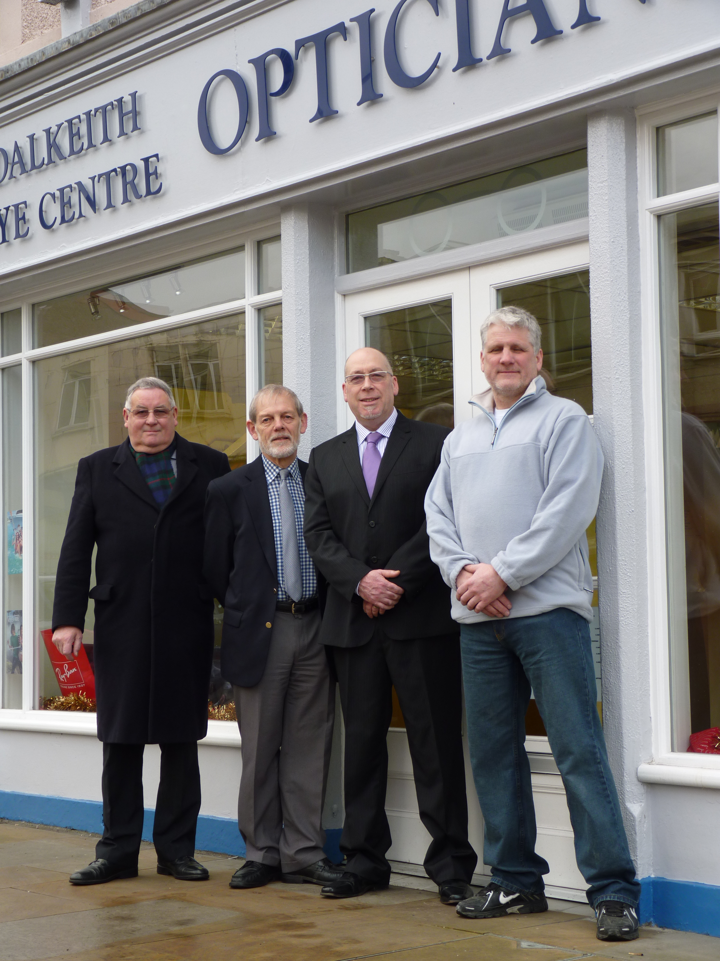 The owner of the Opticians shop, (No 41 High Street), Mr Graham Roberts together with Midlothian Councillor Alex Bennett (also Board Member of Dalkeith Business Renewal), Donald Marshall, Chair of the Dalkeith THI/CARS Project Team and the joiner for the scheme Gary McLay pose for their photographs outside the front of the shop.